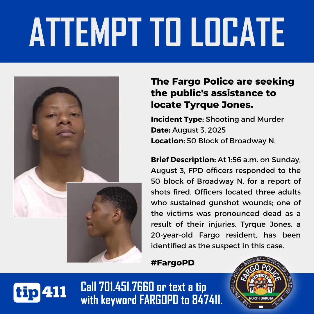 Police say 20 year-old Tyrque Jones of Fargo has been identified as the suspect and are asking anyone with information regarding his location to contact the Fargo Police Department. If you see jones, do not approach or attempt to apprehend him. Instead, call police immediately and provide as much detail as possible, including location, direction of travel, clothing description, or anyone he may be with.