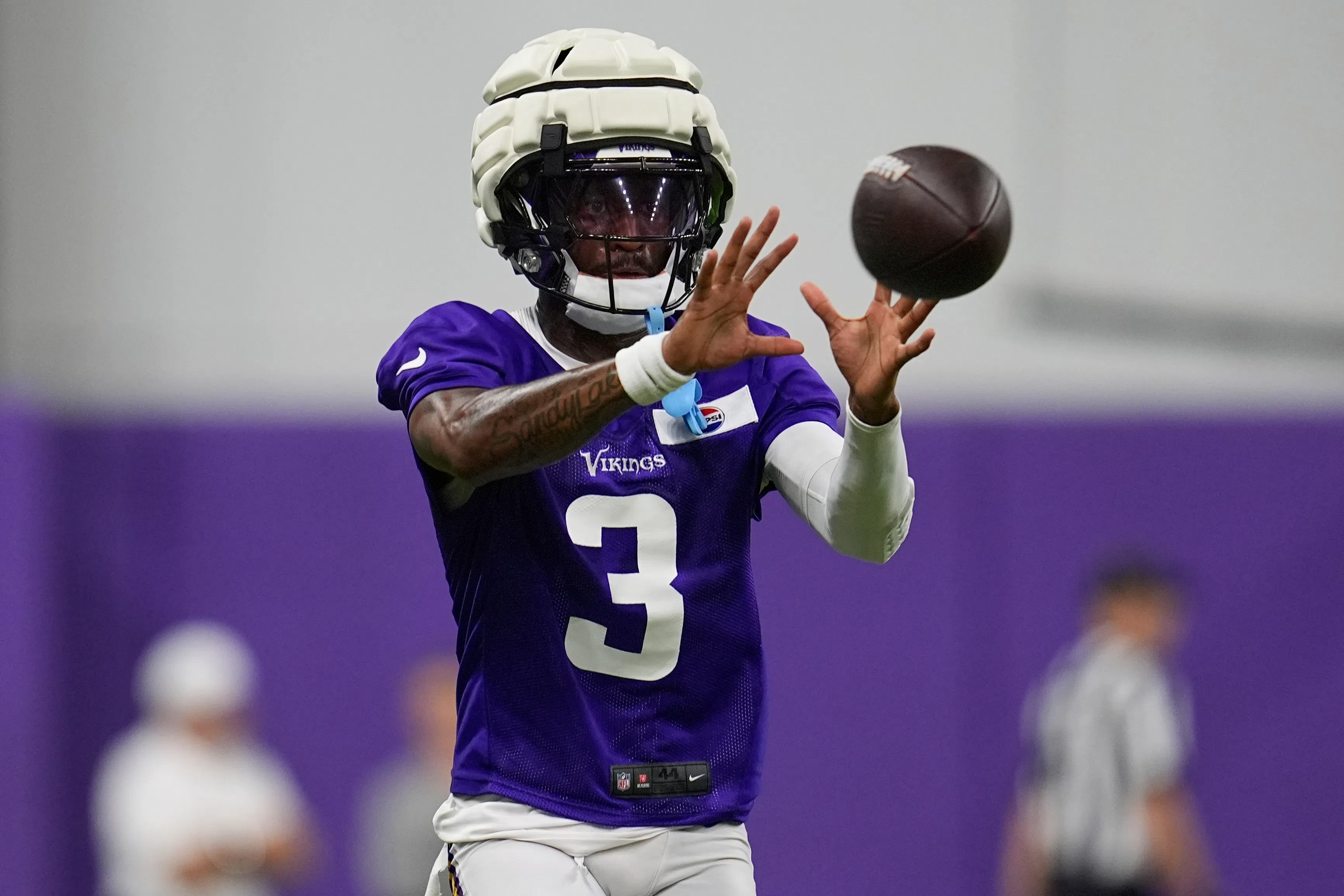Minnesota Vikings wide receiver Jordan Addison (3) takes part in drills during the team's NFL football training camp Wednesday, July 23, 2025, in Eagan, Minn. (AP Photo/Abbie Parr)
