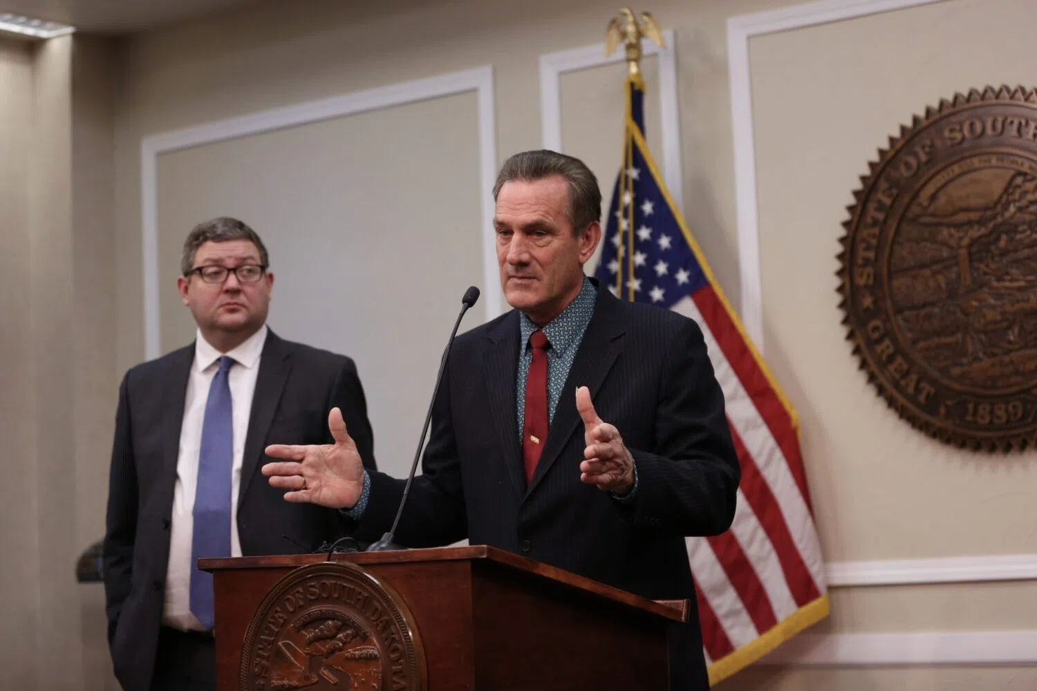 South Dakota Republican Gov. Larry Rhoden speaks during a press conference Feb. 6, 2025, at the Capitol in Pierre with Lt. Gov. Tony Venhuizen. (Seth Tupper/South Dakota Searchlight)