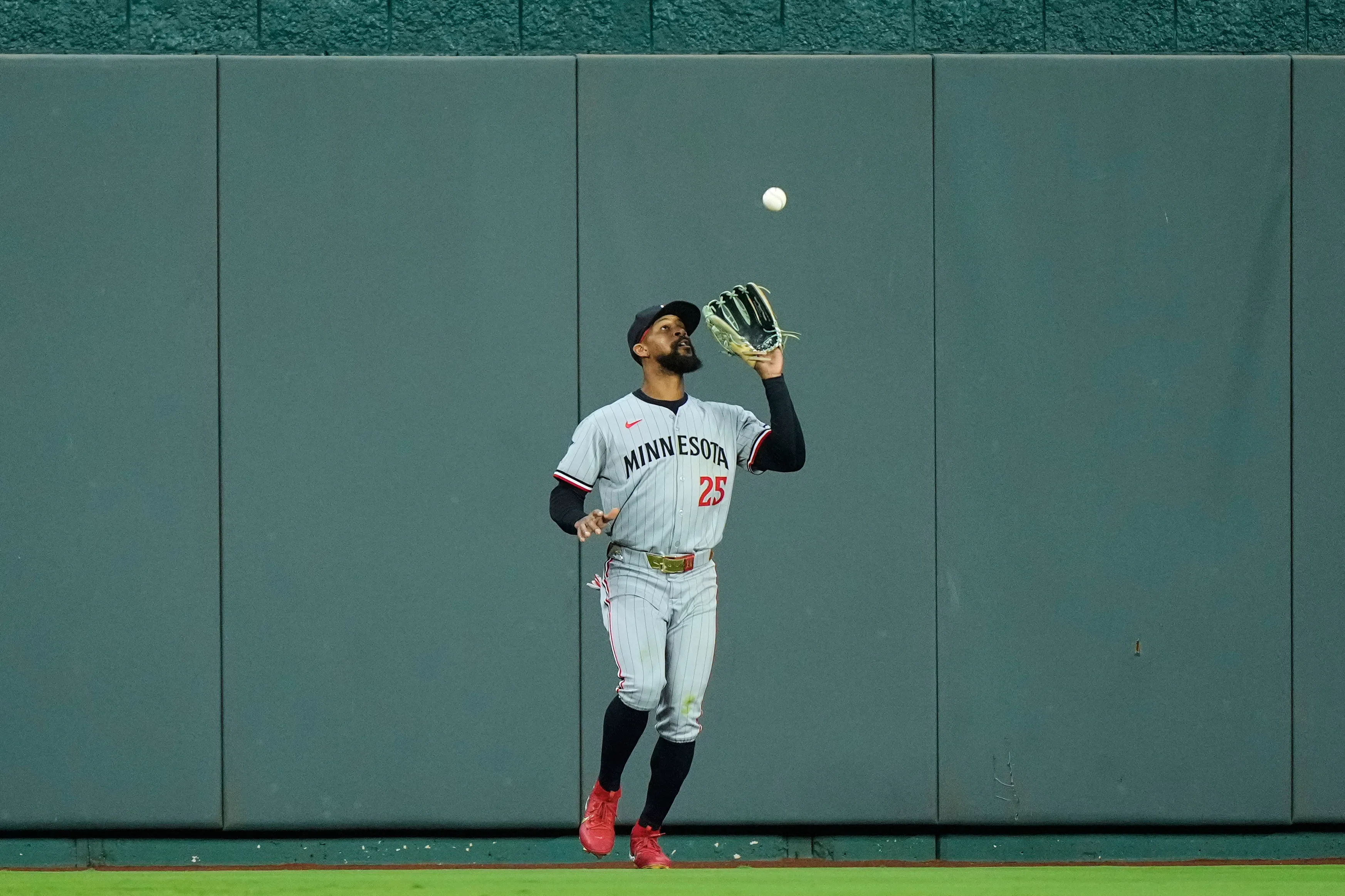 Minnesota Twins center fielder Byron Buxton catches a fly ball for the out on Kansas City Royals' Mike Yastrzemski during the third inning of a baseball game Friday, Sept. 5, 2025, in Kansas City, Mo. (AP Photo/Charlie Riedel)
