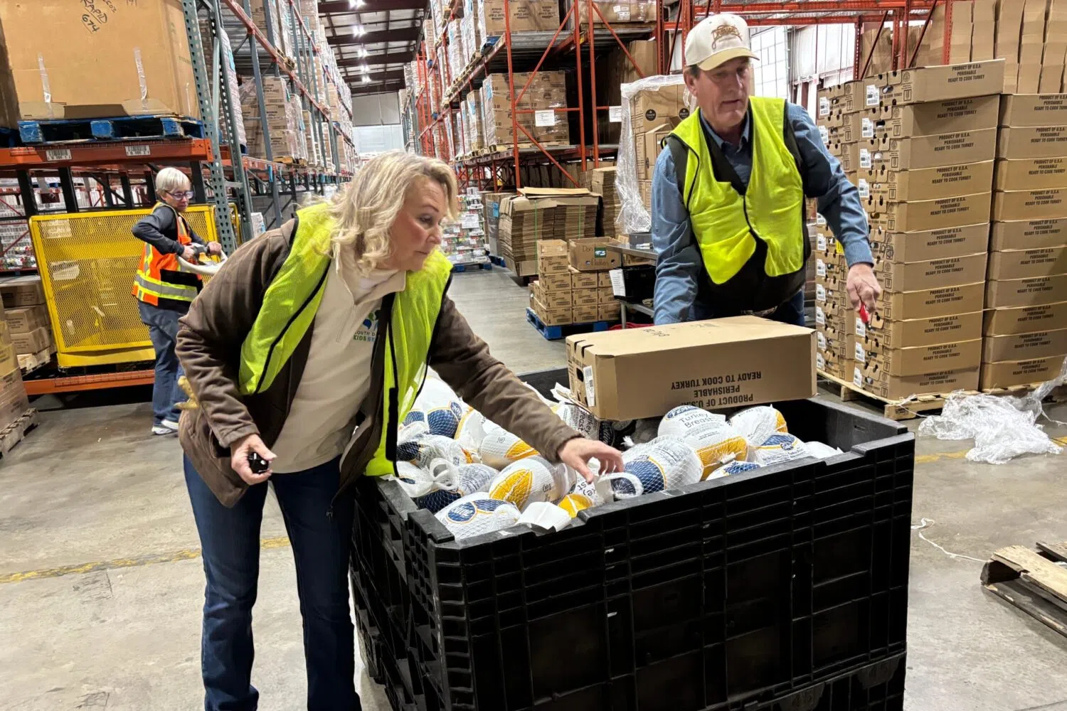 First lady Sandy Rhoden, left, and Gov. Larry Rhoden volunteer at Feeding South Dakota’s Rapid City distribution center on Nov. 3, 2025. (Photo by Seth Tupper/South Dakota Searchlight)