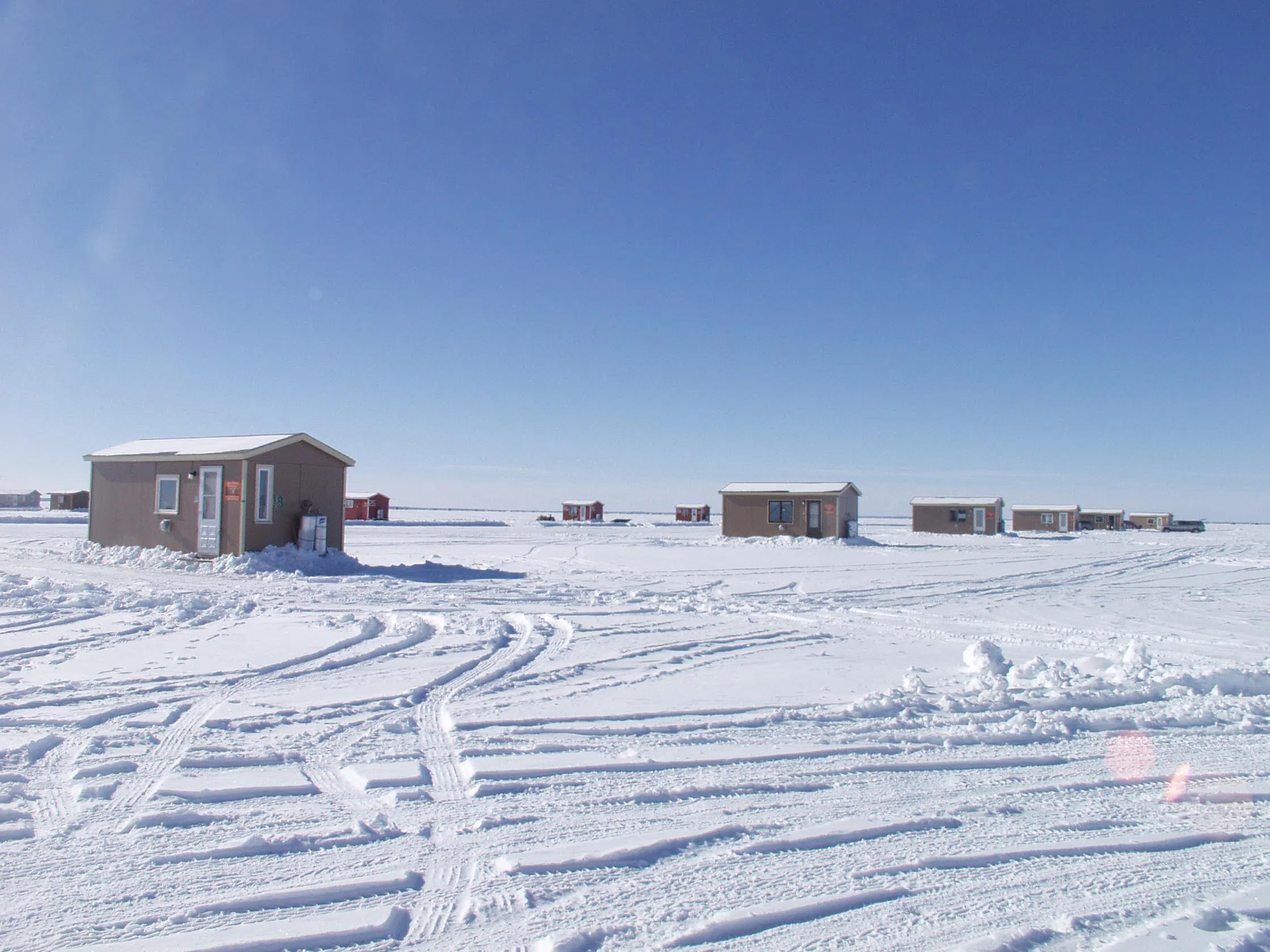 MILLE LACS LAKE, UNITED STATES: Ice fishing houses are pictured 03 February 2006 at Mille Lacs Lake, a two-hour drive north of Minneapolis, Minnesota. Mille Lacs Lake is one of the most popular destinations for ice fishing in the US. AFP PHOTO/Timo Gans (Photo credit should read TIMO GANS/AFP/Getty Images)