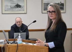 Jodi Smith, executive director of the North Dakota Retirement and Investment Office, listens to a lawmaker’s question during a meeting of the Legacy and Budget Stabilization Fund Advisory Board on Oct. 22, 2025. (Photo by Jacob Orledge/North Dakota Monitor)