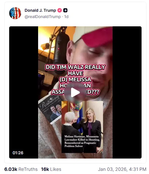 Trump first reshared the video that states Boelter made the claim Walz ordered him to kill Hortman in a letter authorities say they found in his vehicle. Then-acting U.S. attorney Joe Thompson called the letter a “delusion” that seemed “designed to conceal his crimes.”
