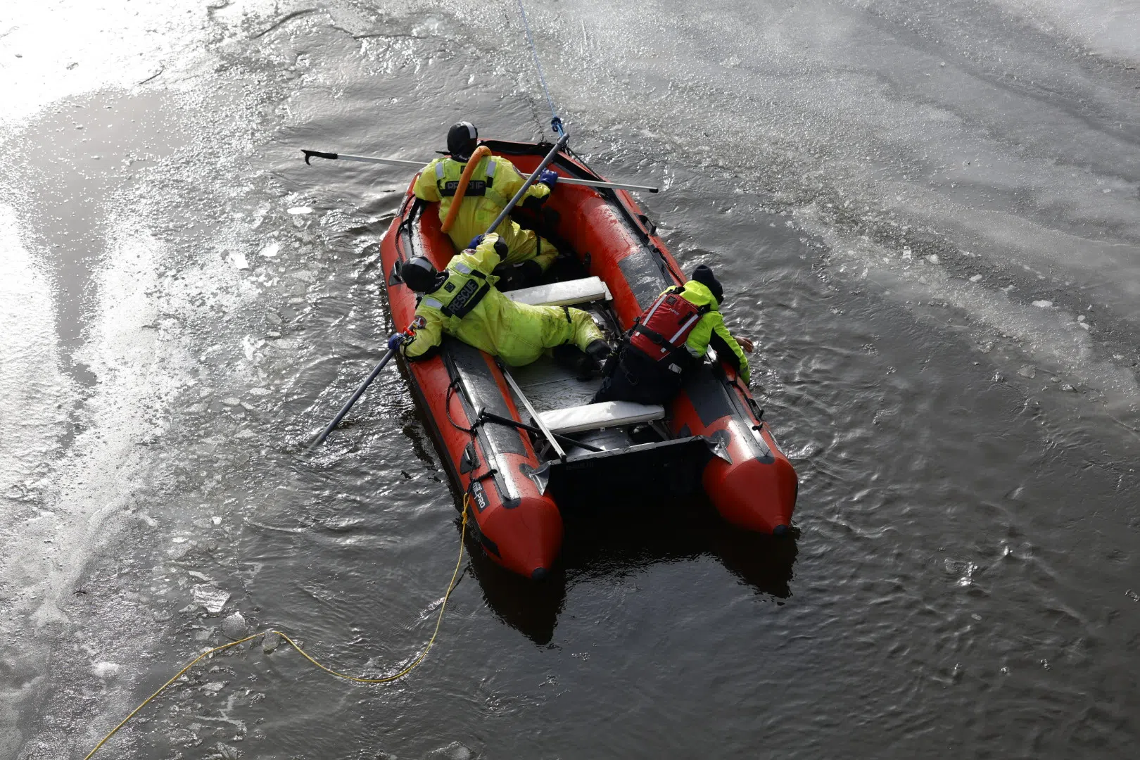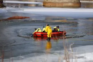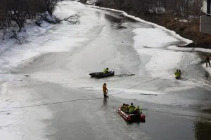 The Fargo Fire Department launched an inflatable Zodiac boat, which can move in the water and on top of the river ice. The call to Red River Regional Dispatch came in shortly after 2:30 p.m. Monday afternoon.