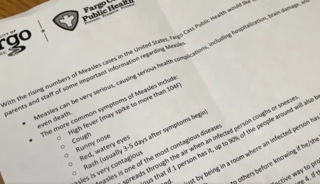 FARGO (KFGO-KVRR) – With Measles cases rising across the country and in North Dakota, Fargo-Cass Public Health has distributed a memo to local students and their families.